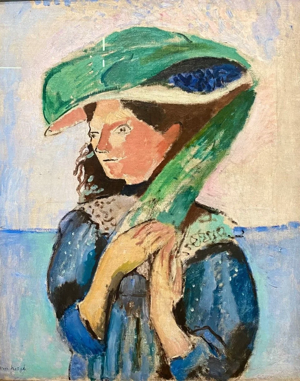 Figure 3. Marguerite in blue polka dot dress and elegant green hat, Matisse, 1906