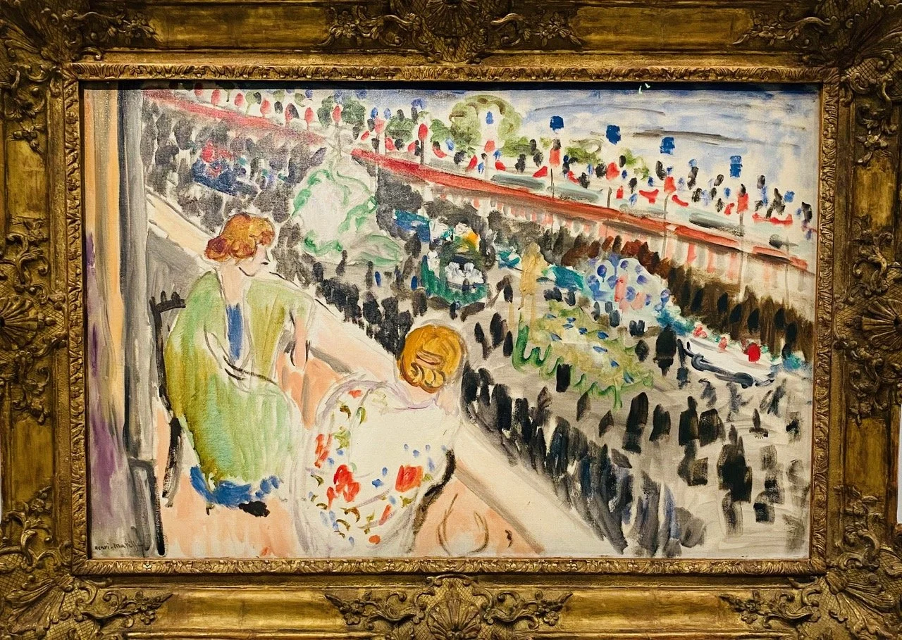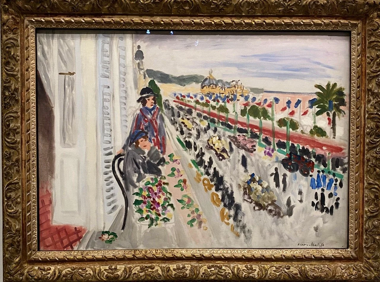 They pose outdoors, too, on the balcony of the Hotel de la Méditerranée. (Figs 22, 23) Matisse shows the two young women enjoying their bird’s eye view of the Festival of Flowers, a grand parade of flower-covered floats, introduced during the Belle Epoque. In both paintings, the elegantly dressed young women observe the activities on the Promenade des Anglais beneath them