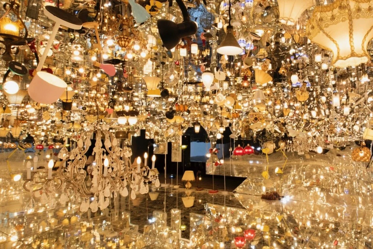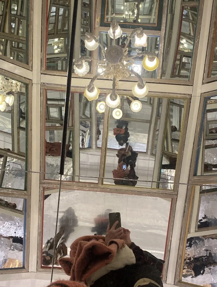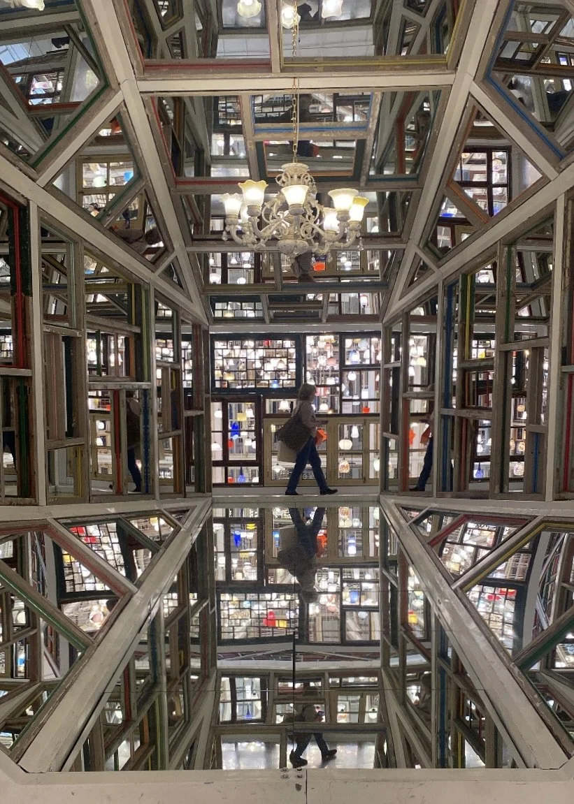 On the second floor, are mirrored ‘fun houses’ which, according to the Pace Gallery which represents Song, “draw on the concept of mirrors in traditional Chinese feng shui while philosophically exploring the idea of ‘borrowing,’ prompting viewers to contemplate humanity’s transient existence on Earth. This immersive hall of mirrors, made of salvaged doors and windows, invites visitors to lose themselves in reflections, in houses illuminated by hundreds of lamps that blur the line between reality and illusion.” (Artthat, 09/2025).