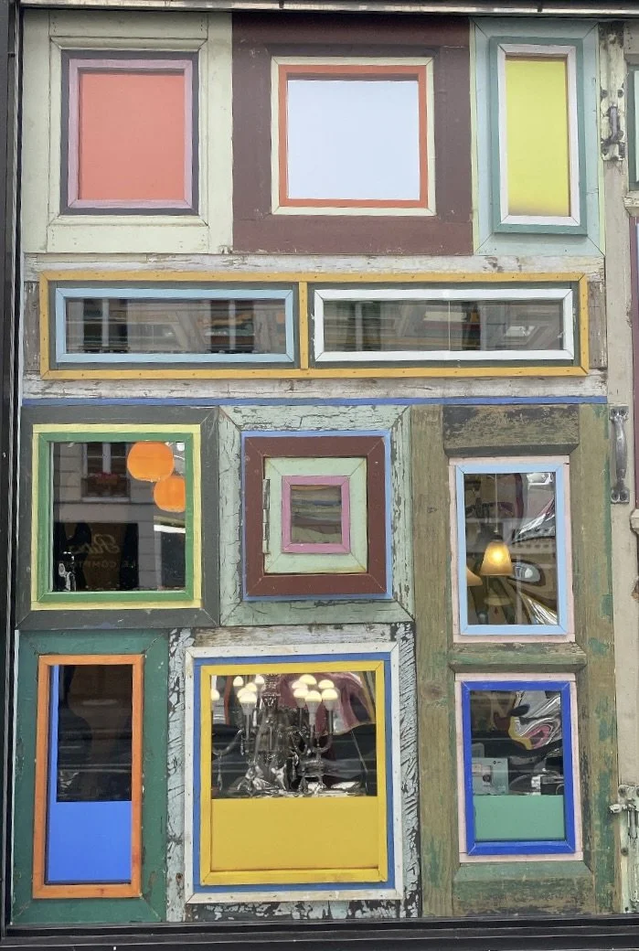 Visitors are welcomed to enter both of these structures. One is more disorienting than the other. The walls and ceiling and floor are mirrors. I hesitated before stepping into the space, before walking onto the mirrored floor. Once inside, I had the sense that I was walking on a void, that nothing was holding me up. Hanging from the mirrored ceiling are lots of lamps. We see their reflections and our own on the mirrored walls. One reviewer noted a similarity between these mirrored spaces and Yayoi Kusama’s Infinity Rooms. I have been in quite a few of Kusama’s Infinity Rooms. In them I have experienced a sense of joy rather than disorientation. The second structure was much less disconcerting. Although the floor is mirrored, the walls are pierced by windows, from which you can look out and orient yourself in the reality of the store beyond. (Figs 14-18)