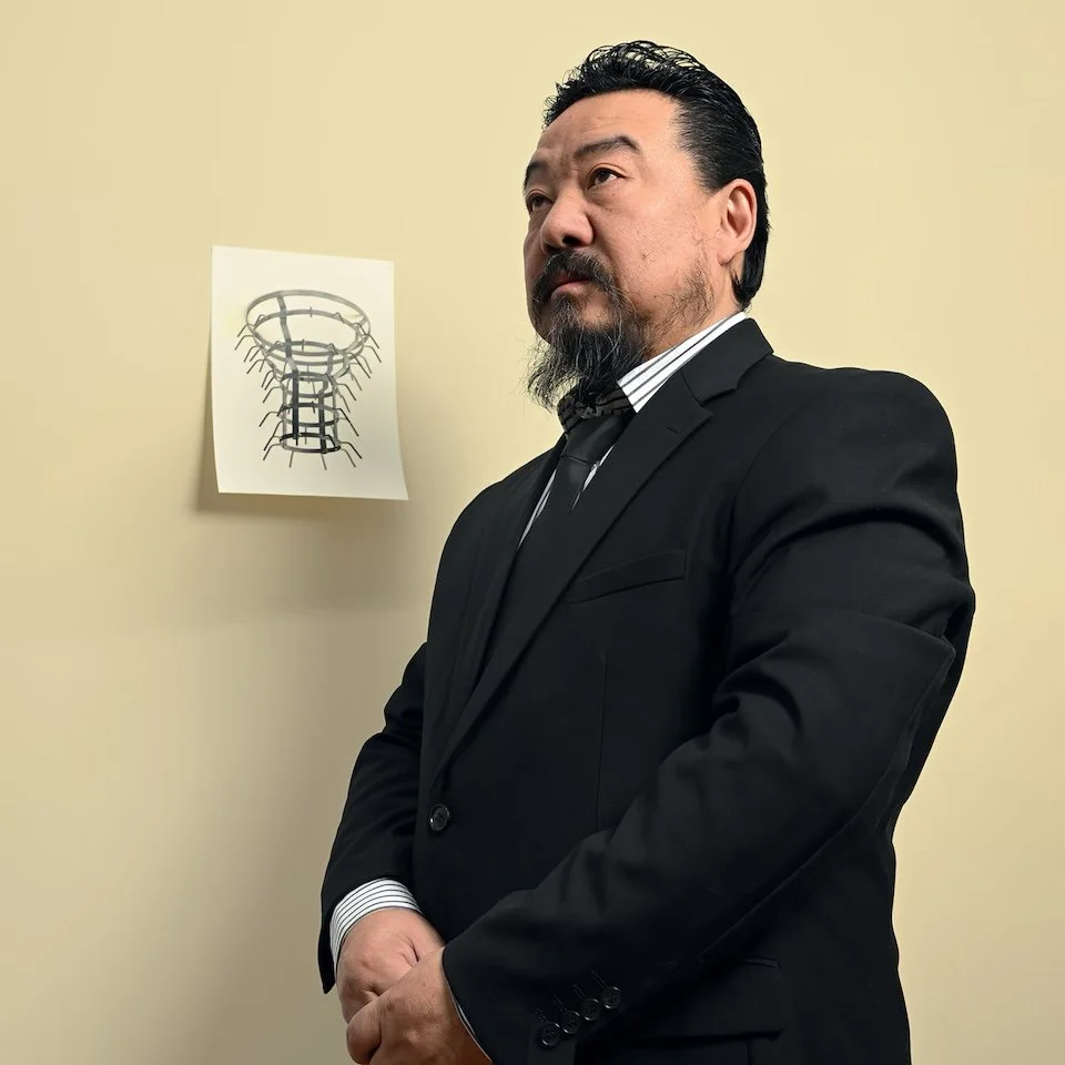 This year, Le Bon Marché chose the Chinese conceptual artist, Song Dong to create an exhibition, the title of which is ‘Objets divers et variés (Various and varied objects).’ The first thing you see as you approach the store is a huge poster mounted on the facade. It is a photograph of the artist and is part of an ongoing series of self portraits he is creating each month to document the changes in his physical appearance. “The idea (according to Song) is to show, through this series of self-portraits, how our faces …. change radically depending on circumstances and situations….” For January 2026, he depicted himself as a salesman or doorman of a department store, dressed in a black suit. The sketch of the object behind him will make sense once you get inside.(Figs 1, 2)