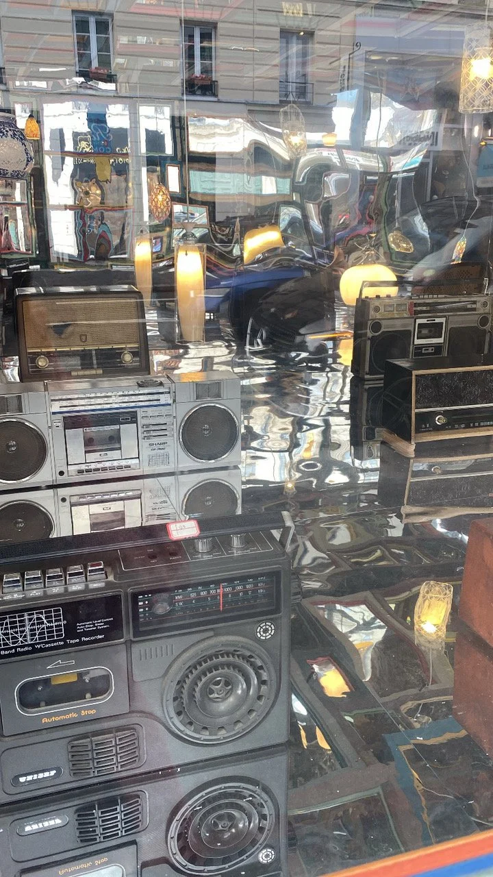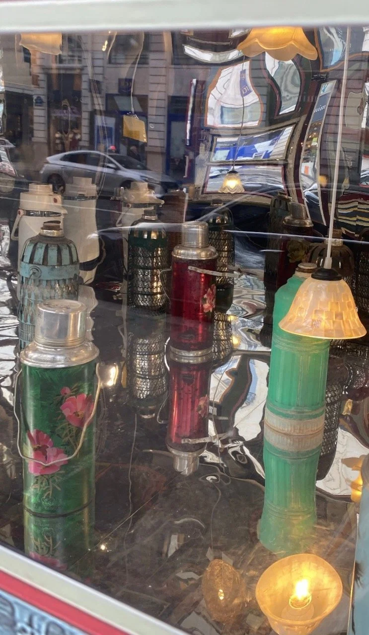 But first the outside. The store windows along Rue de Sèvres, Rue de Babylone, and Rue du Bac, are covered by what looks like old and worn painted wood. Each faux, trompe l’oeil wall is pierced by various square openings, like windows. As you peer into these windows, you are dazzled both by the light of hanging lamps and the reflective surface of the background mirrors. They highlight the objects in the windows. Each window has a different category of object. In one window there are telephones, among them clunky landlines and chunky cell phones. In another window are thermoses that Nicolas explained to me, are ubiquitous in China. People carry them wherever they go (he had one with him) filled with hot tea. Behind the door of another window were radios and behind another, record players, and so on. (Figs 3-6)