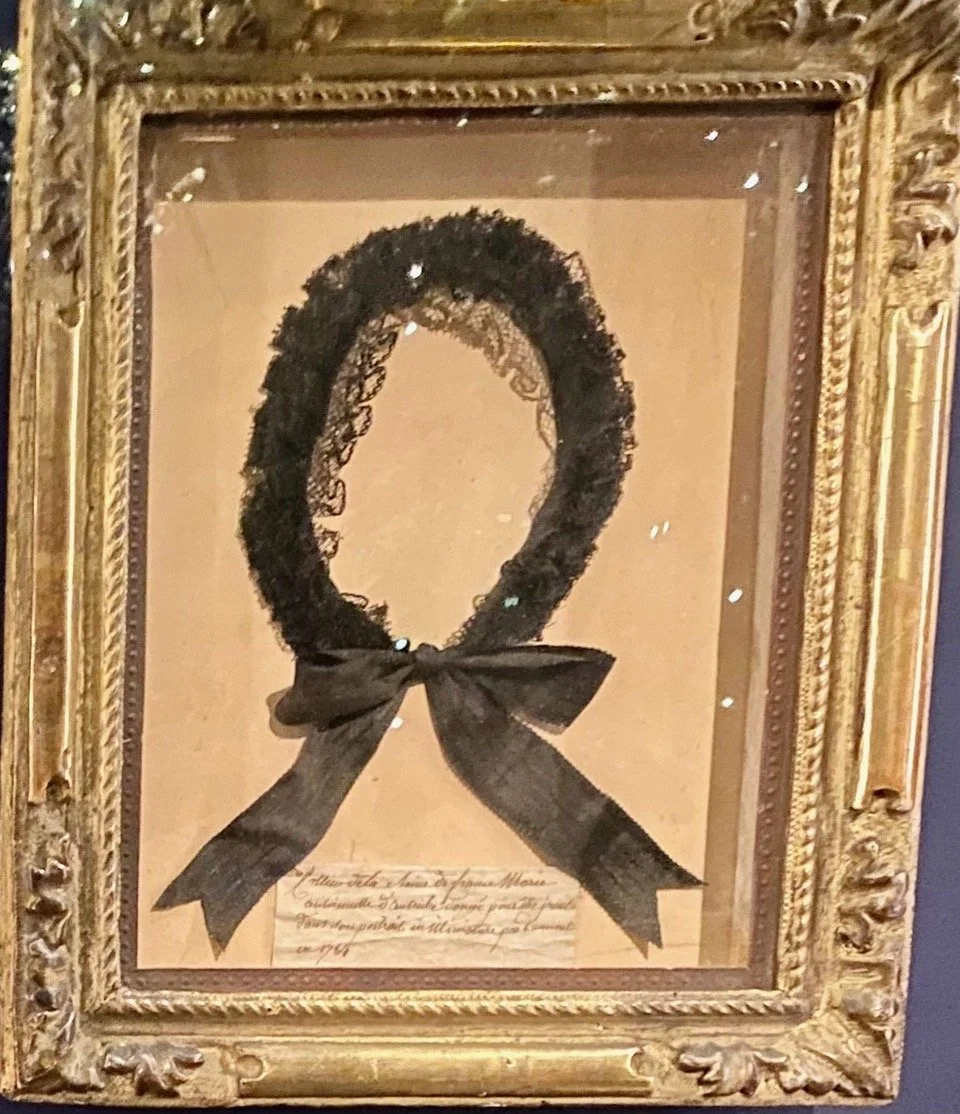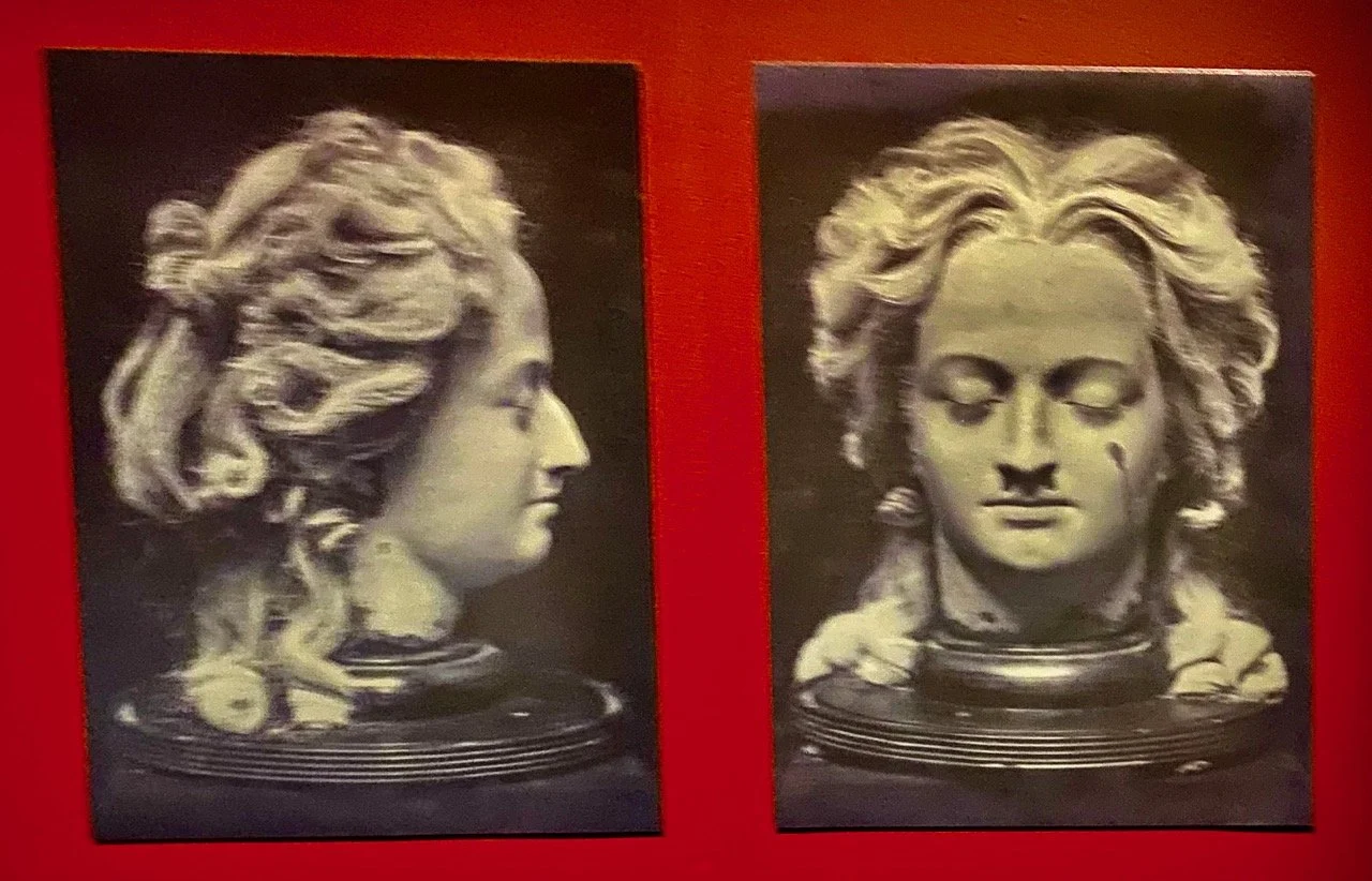 A warning that the subject may not be suitable for everyone is posted on the wall before you enter a tiny room in which obscene, sexually explicit cartoons defame the Queen. The queen wrote this to her mother, ”The gazette writers and novelists know more about my [private life] than I do.” The cartoons are like the ones I saw at the Marie Antoinette exhibition at the Concergerie in 2019. As I noted then, salacious images of the queen abounded as the country headed toward Revolution. One historian suggested that they were the kinds of attacks usually reserved for the King’s mistresses. Louis XVI had no mistresses so the attacks were all heaped upon this queen. In plays, pamphlets and prints, M-A is shown having sexual relations with the Marquis de Lafayette, a priest, her ladies in waiting and a host of barnyard animals. Not only did these attacks heap disdain upon the queen, by questioning her fidelity to the king, they questioned the paternity of her children and their right to the French throne. And then, we are in a “dark octagonal chamber where her imprisonment and execution are described.” A guillotine blade is here, said to be from the family of the executioner himself. There is a print of her head being held aloft. And a wax death mask from Mme Tussauds in London. (Figs 29-33).