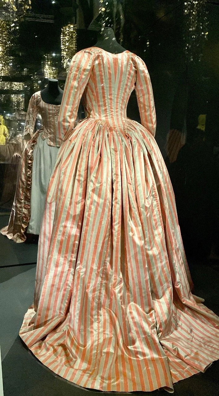 Until the late 1780s, M-A changed her wardrobe every year. Her ladies in waiting then chose amongst ‘last year’s gowns’ the ones they wanted for themselves, to keep or sell or repurpose. What gowns M-A still had at Versailles were damaged in 1789 when a mob invaded the palace; what remained of those were damaged or destroyed in 1792 when the Tuileries palace, where the royal family had been taken, was attacked as the king and queen with their children were transported to the Temple prison. After her imprisonment and execution, what little was left was scattered. There is a small sampling of the very few authenticated M-A garments in the V & A exhibition, but not her corset. I’ll tell you why in a moment. Portraits of M-A and gowns worn by others have to suffice. There are robes a la française, robes a la anglaise and robes a la polonaise. And a handy primer for telling them apart and when they were worn. Among the gowns, there is one that the Queen of Sweden wore for her wedding. It is thought that M-A’s wedding gown would have been similar. Also on display is a wardrobe book from the Archives Nationale in Paris that contains samples of the 101 dresses that M-A ordered in 1782. (Figs 8-14)