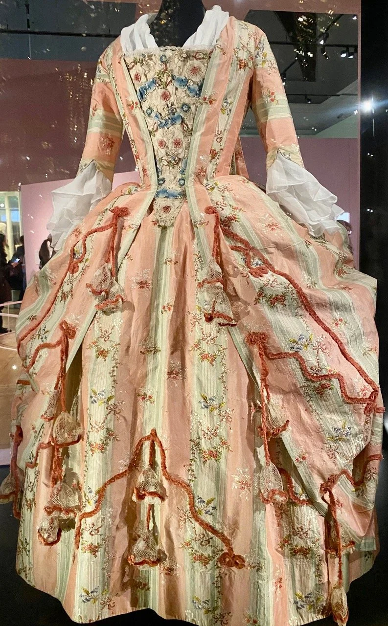 The second gallery, called “A Style Icon,” is a dark room twinkling with mirrors that permit you to see the many gowns on display from both fore and aft, their elaborate fronts and their impressive backs. M-A arrived at the French court at age 14 (1769). For the next 20 years, whatever M-A wore wherever she went was inspected, dissected and copied. As the curators note, the dress code at court was rigid, yet M-A found ways to use it as a spring board ‘for bold new styles.’ She played around with the code, made it her own.