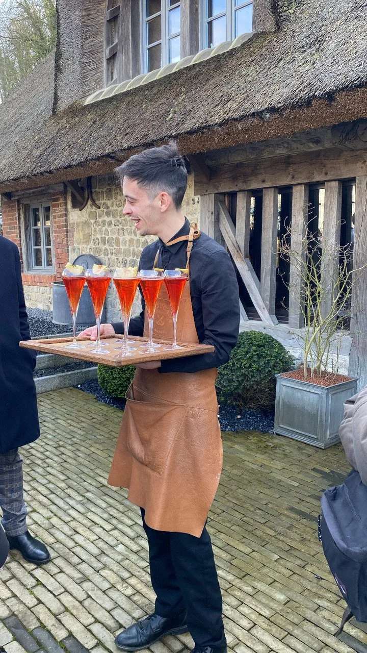 Figure 20. Waiters welcoming us at La Ferme Saint Siméon with ‘Cider with rising sun’ Cocktail (see Fig 3)