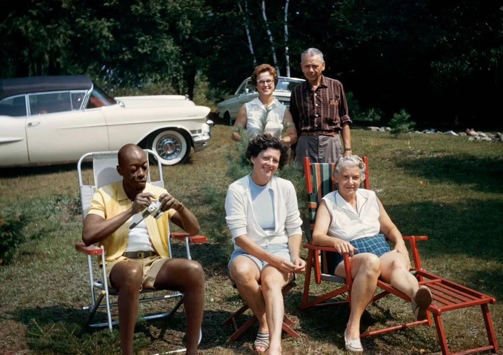 While Diop was at Deauville he collaborated on The Anonymous Project with Lee Shulman who has a collection of color slides taken by and of anonymous people. The pair did something radical with photographs from Shulman’s American slides from the 1950s and 1960s. Pictures of white middle-class families doing ordinary things - celebrating, relaxing, etc. Into these scenes, they dropped Diop. At first it’s a sight gag, the only black man at the party. But, the closer you look, the creepier it becomes. These are photographs of white people in post-war segregated America. What would they have made of Diop. What would they have done with/to an attractive, well dressed black man who dared to crash their party? (Figs 7, 8)
