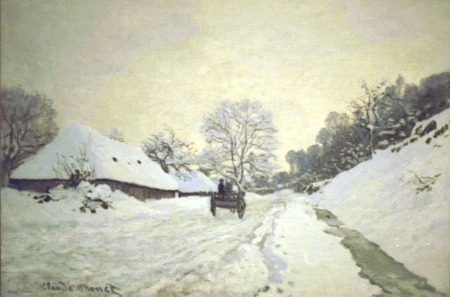 In 1864, Monet was at the farm (room and board, 40 francs a month!) in the autumn and he was still there when it started snowing. He painted “Road toward the Farm Saint-Siméon, Honfleur.” From 1864 to 1867, Monet painted at least ten views of this road, in what many believe was his first continuing investigation of a single subject. (Fig 18) Here is how one observer described watching Monet paint, “We glimpsed a little heater, then an easel, then a gentleman swathed in three overcoats, with gloved hands, his face half-frozen. It was M. Monet, studying an aspect of the snow.”
