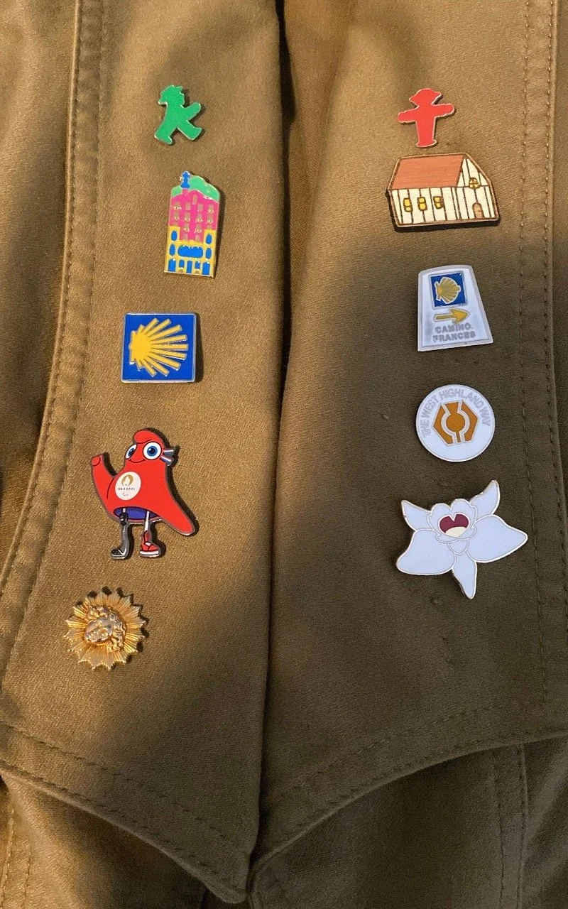 Figure 12. Some of the pins I’ve collected (top - stop and go signs from German, bottom right, white orchid, Proust)