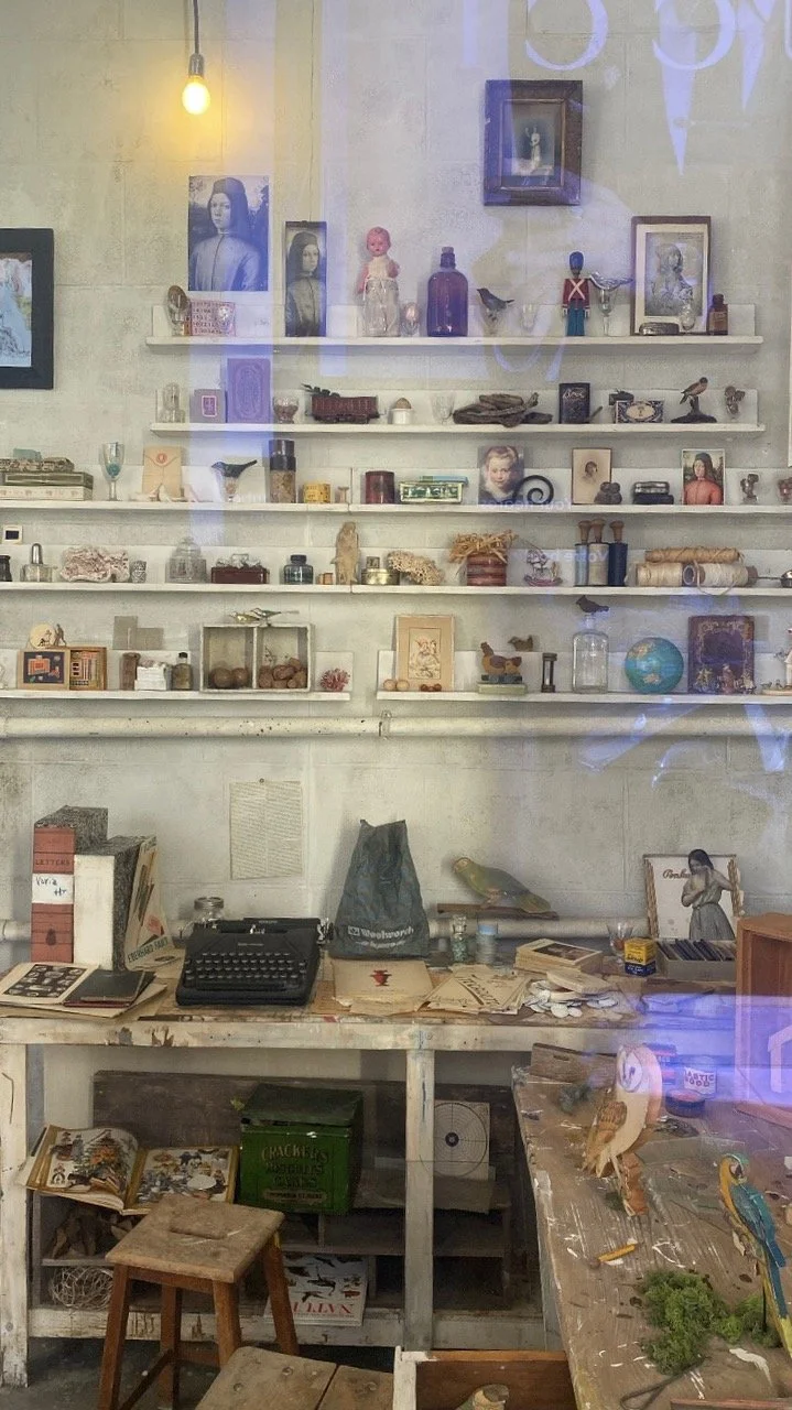 Sharp explained that he and Anderson turned the Gallery’s “shallow first-floor space into a ‘ginormous Cornell box.” To recreate the studio, Anderson and Sharp, working with exhibition designer Cécile Degos, used visitors’ descriptions and historical photos to rebuild sections of the workshop. For the contents of the workshop, which had been scattered when Cornell died in 1972, they relied on the same first hand accounts and historic photographs. Of the thousands of objects on display in the Gagosian windows, about 300 belonged to Cornell (including a View-Master and a Smith Corona typewriter). These were lent to the exhibition by the artist’s family and friends. Other things were painstakingly recreated by craftsmen and collaborators from Anderson’s films. For example, “the wonderful wall of whitewashed shoe boxes where Cornell kept all his seashells and driftwood and different things,” were recreated by two painters who work with Anderson. They spent weeks studying Cornell’s handwriting so they could write labels like he did on the ends of all the boxes that other craftsmen that Anderson knew, recreated. For objets, Sharp and Anderson went shopping. Like Cornell did, at flea markets, like he couldn’t do, on eBay and Etsy. Once their hauls had been assembled, another movie expert aged the objects they found.