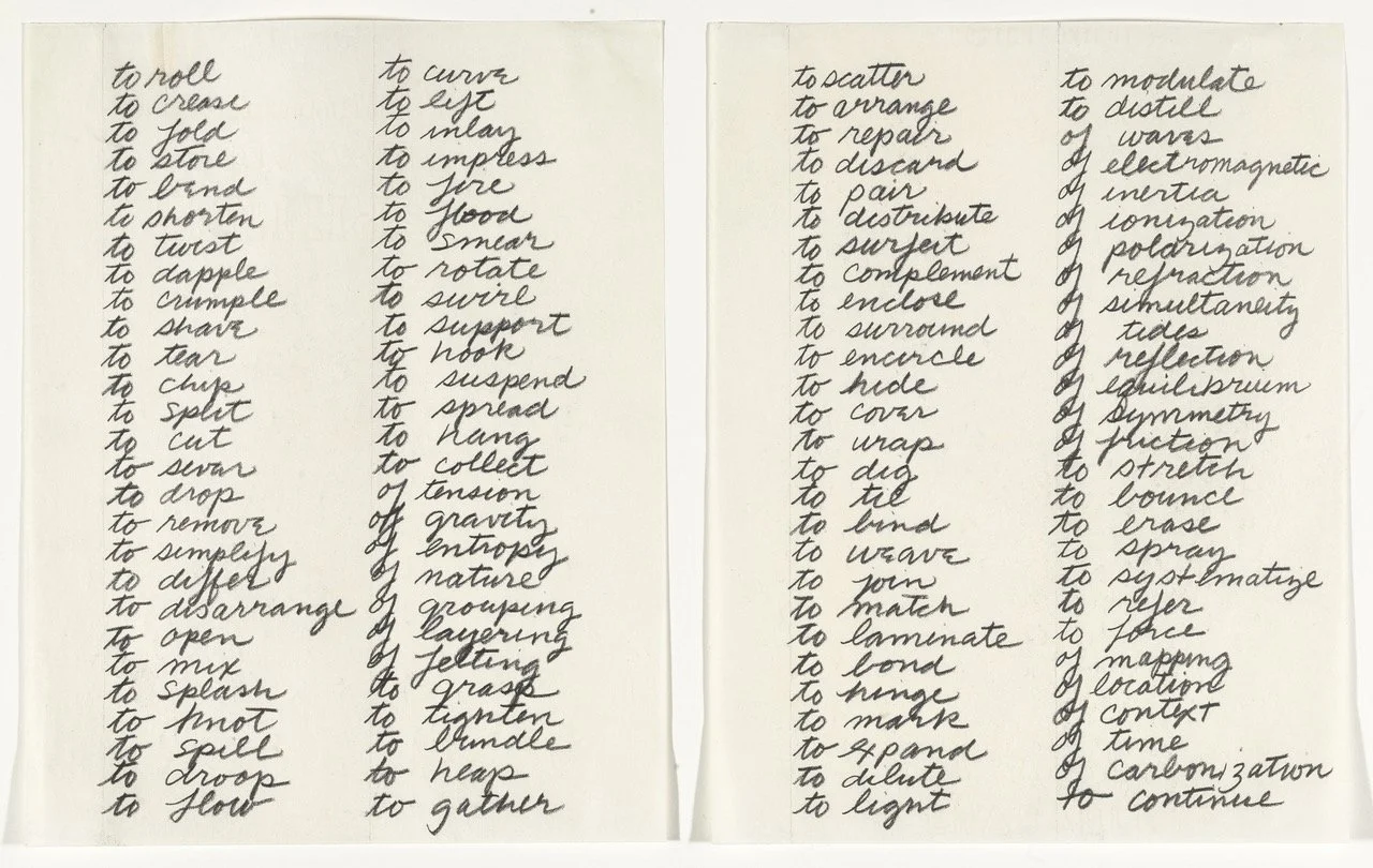 Before he turned 30, Serra wrote what he called his Verblist. (Fig 7) It’s a list of 84 active verb infinitives, to roll, to crease, to twist, to crumble, to tear, etc. Serra explained the importance of those verbs this way, “I was very involved with the physical activity of making. It struck me that instead of thinking about what a sculpture is going to be and how you’re going to do it compositionally, what if you just enacted those verbs in relation to a material and didn’t worry about the result?”