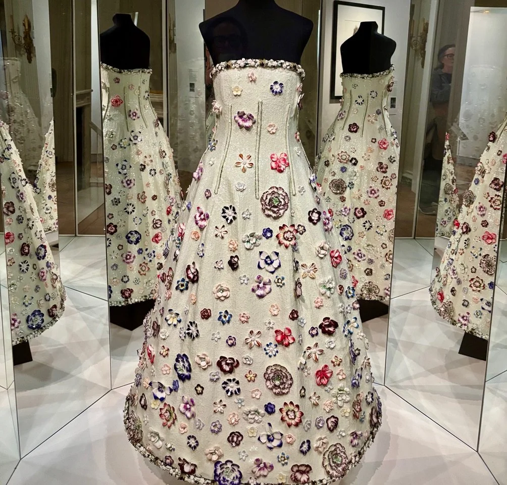 Figure 48. Gown by Karl Lagerfeld for Chanel, 2019. Acetate and silk organza canvas, entirely embroidered with a scattering of glass beads and multicolored, porcelain-effect flowers, hand-painted and varnished, on a background of aqua green sequins.