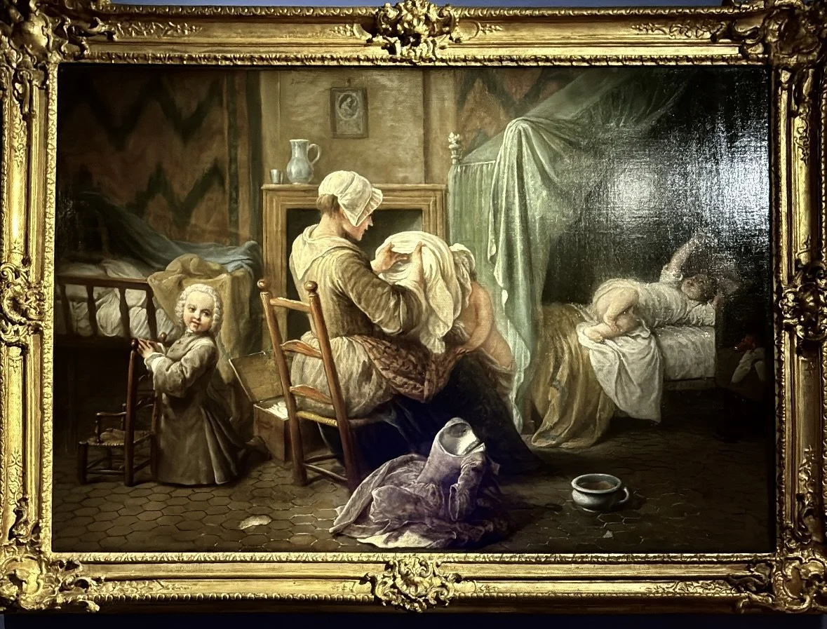 In the next section, “Portraits of Sensibility: Family Bliss and Childlike Wonder,” we are presented with a very different kind of portrait. No longer individual women in solitary pursuits dressed in elegant gowns but women and occasionally couples, with their children celebrating conjugal bliss and the pleasures of parenthood. These portraits en famille, in which women, often wearing simpler gowns, and depicted with playful children, reflect real societal changes. Images of women, as doting mothers, were part of a movement in 18th century French art, literature and philosophy, celebrating motherhood. At a time when it was (incorrectly as it turned out) feared that the population of France was declining, Diderot encouraged men of ‘feeling and sensibility’ to “give your wife children, give her as many as you can, and give them only to her.”(Figs 32-34)