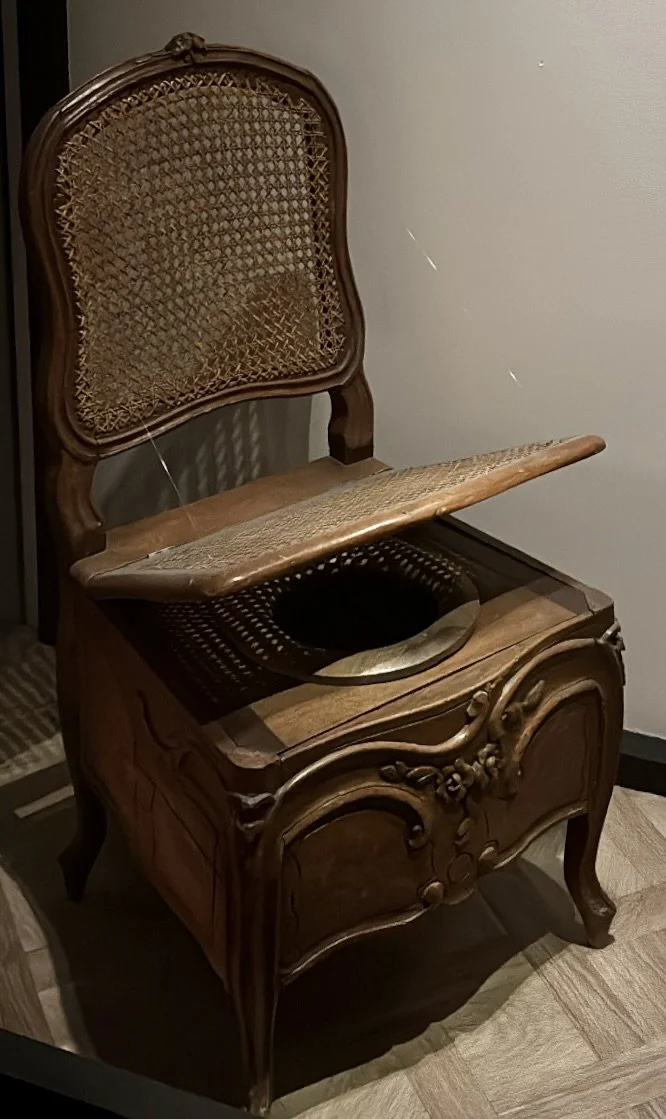 Figure 15.Chamber stools used during the day (vestiges of which we use for potty training toddlers). Chamber pots (tucked under the bed) were for nighttime use. A servant would discretely take from the bedroom and dump wherever the family dumped its night soil. After a woman was dressed, she would pee in a bourdaloue, which looks for all the world like a gravy boat. Since women wore crotchless panties, they could easily slip a bourdaloue under their skirts. The device got its name from a long winded 17th century French preacher, Louis Bourdaloue.