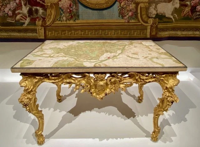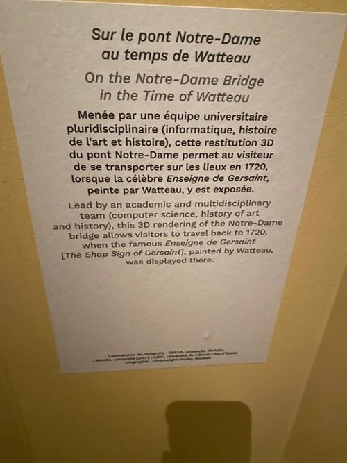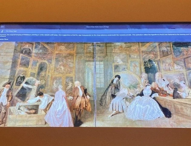 The piece de resistance at the Cognacq-Jay exhibition was a life-size recreation of one of my favorite paintings of all times, Antoine Watteau’s l’Enseigne de Gersaint, (The Shop Sign of Gersaint), (Fig. 20). Watteau painted it in 1720 for the marchand-mercier, (and art dealer) Edme François Gersaint. Created as a shop sign, it shows the interior of Gersaint’s shop, though considerably exaggerated since it was basically a closet size public space with a back room. But its location was perfect - on the medieval Pont Notre-Dame. Watteau’s painting is featured at the Carnavalet, too, as an interactive, 3-D map that you can manipulate to see the shop from a variety of angles as you cross the bridge where it stood. (Figs. 21, 22)