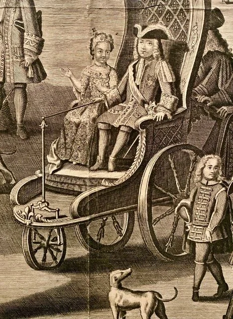 Let’s see, what else happened during the Regency. Well, in 1719, France, England and the Dutch Republic went to war against Spain. After Spain’s defeat, a Franco-Spanish treaty was signed (1721). What better way to strengthen the alliance than with a royal marriage. Little Louis, then aged 9, was betrothed to the 7 year old daughter of Philip V of Spain. (Figs. 32, 33) The future bride arrived in France, moved into the Louvre (a palace at the time), and waited to grow up. After a few years, everyone agreed that the wait would be too long for this little girl to start giving birth to royal heirs. So she was sent back to Spain.