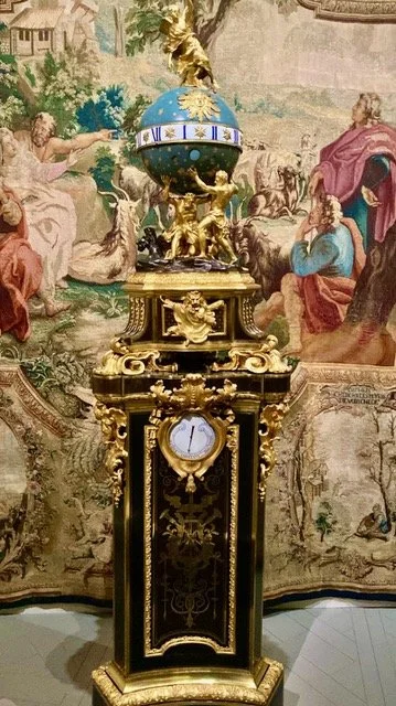 Even though Louis was not old enough to rule, when he reached the age of 7, in 1717, he was too old to stay with his beloved governess. His education became the responsibility of a governor who taught the young King how to review a regiment and how to receive royal visitors. How to ride horseback (Fig. 23) and how to hunt. He learned Latin and Italian, (Fig. 24) history and geography, (Figure 25) astronomy and mathematics and drawing and cartography. Science and geography continued to fascinate the king throughout his life. (Figs. 26, 27). Surrounded as always by beautiful objects. (Figs. 28, 29, 30)