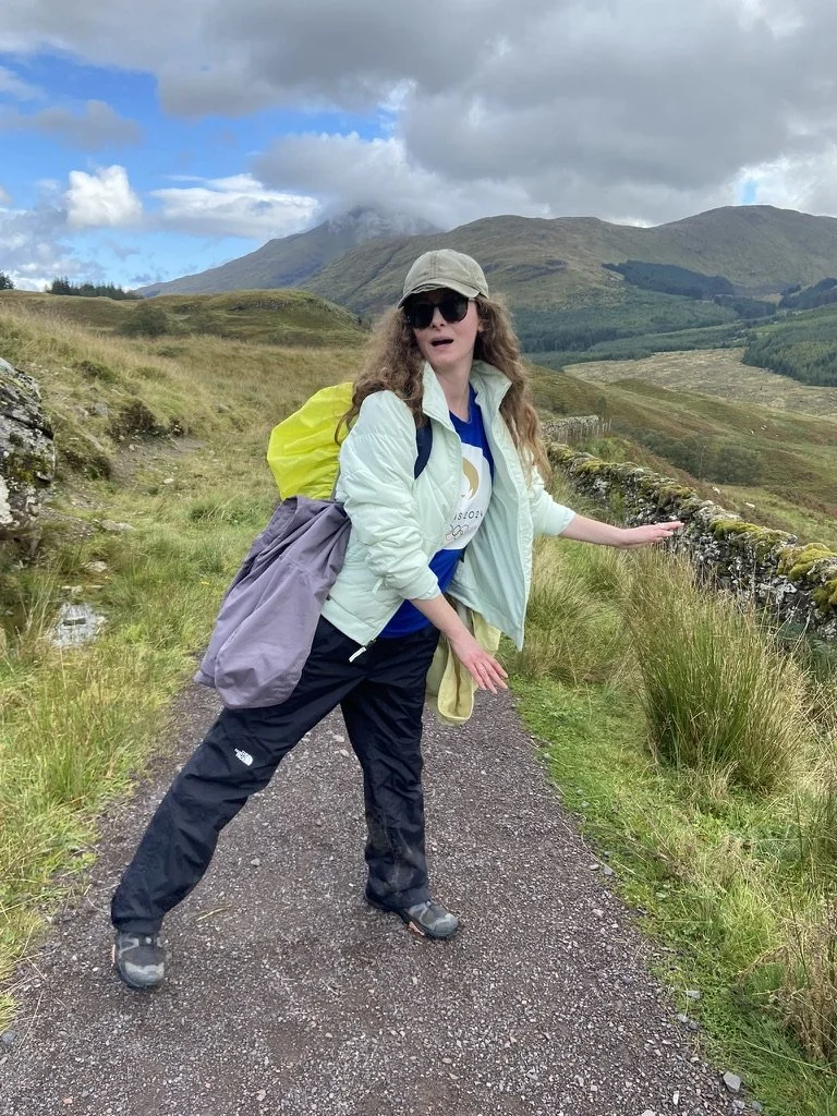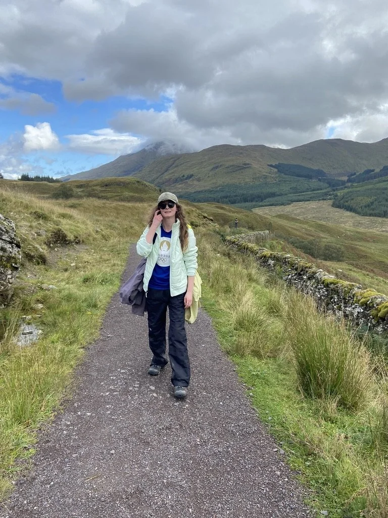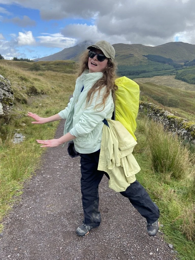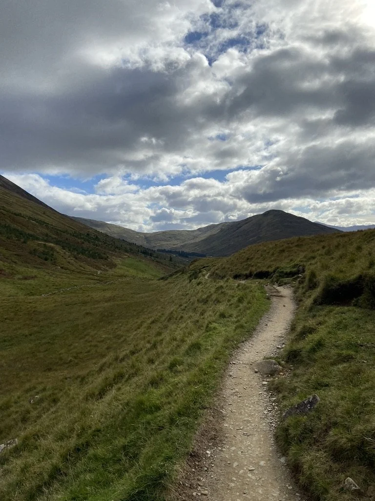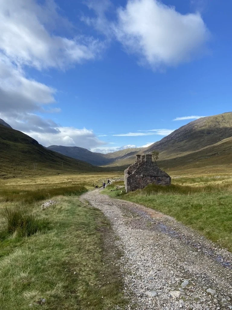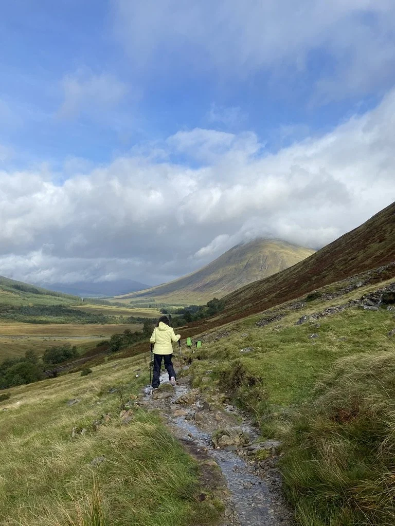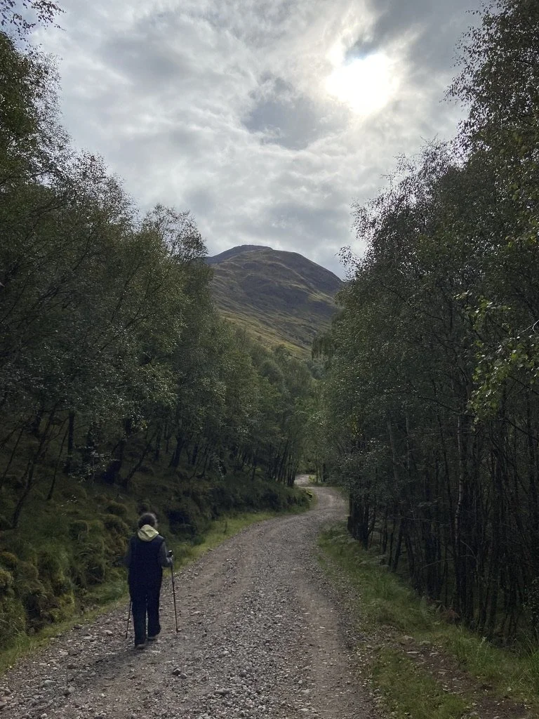 19 September: Inveroran to Kingshouse: As we set out on this walk a group of female deer crossed the path very cautiously and extremely elegantly. I felt a bit guilty having eaten venison sausage the night before. This walk took us out onto the moors which I loved which was way Wuthering Heights. We took a break for lunch and looked out over the vast scenery and then I went on a side quest on my own to find a wee place to take a wee wee. Well I wanted privacy so I had to venture out a bit and I finally found a rock formation that felt promising but when I got up I wasn’t really sure where I had left Mom! Luckily there was another lady who had been sat nearish us and I could see her jacket. Very thrilling! When I found Mom she told me she had looked down at her phone and then had looked up and I was completely gone. I blended in with the scenery!! We arrived at Kingshouse too early to check in which made me mad because I would have liked to have done more frolicking on the moors.