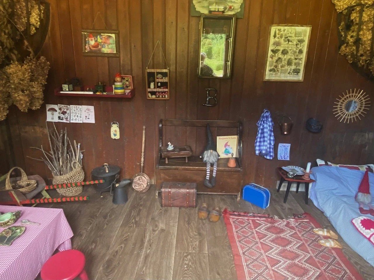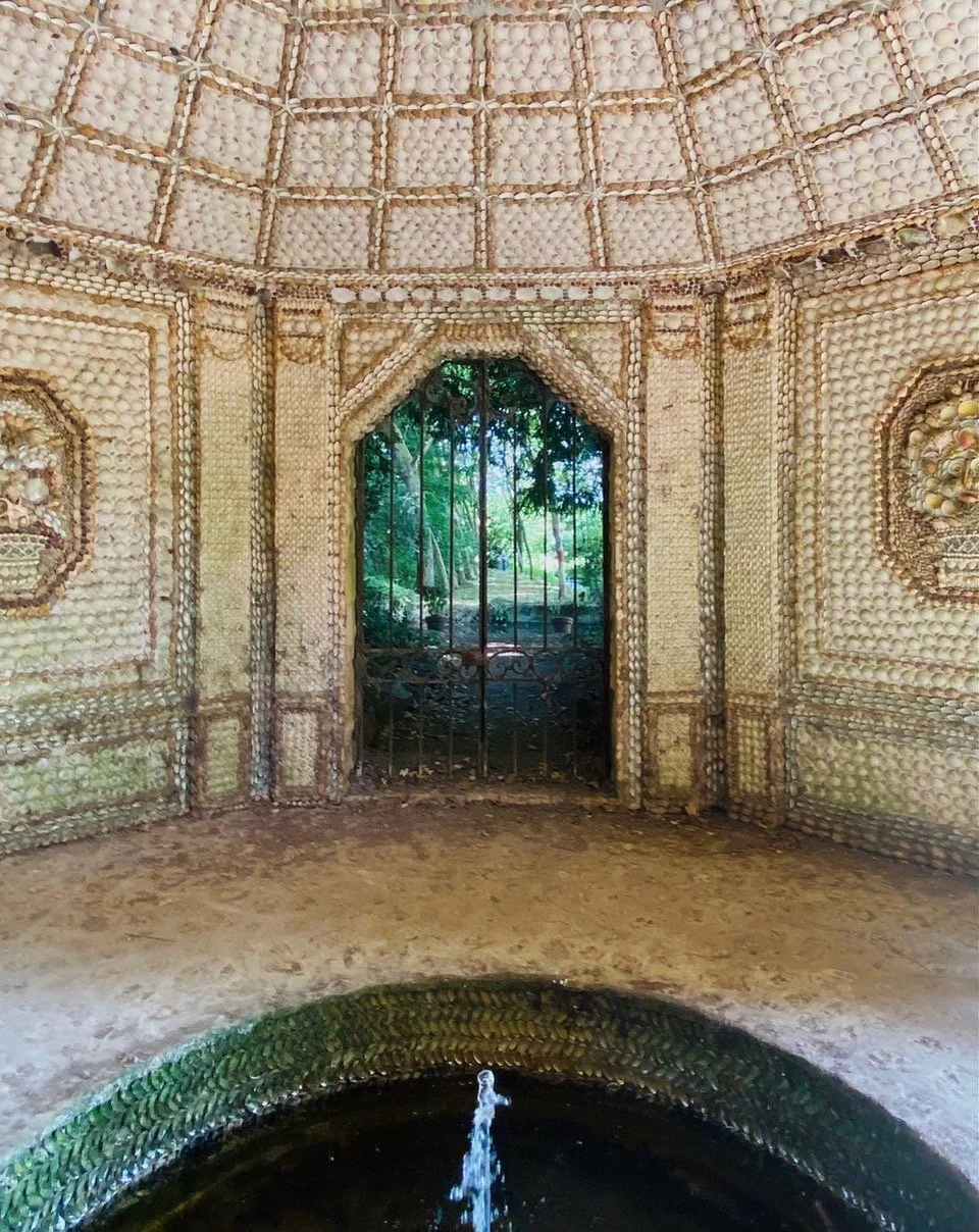 The Shell Cave. Under a pavilion with an exotic-inspired copper roof, is a "cool room" where one can rest on very hot days. “According to Greco-Roman mythology, a young nymph, pursued by the god Pan, took refuge in a cave, taking the form of a fountain of pure water…The 200,000 shells used in Vendeuvre create the supernatural atmosphere suitable for the nymphs' dwelling.”
