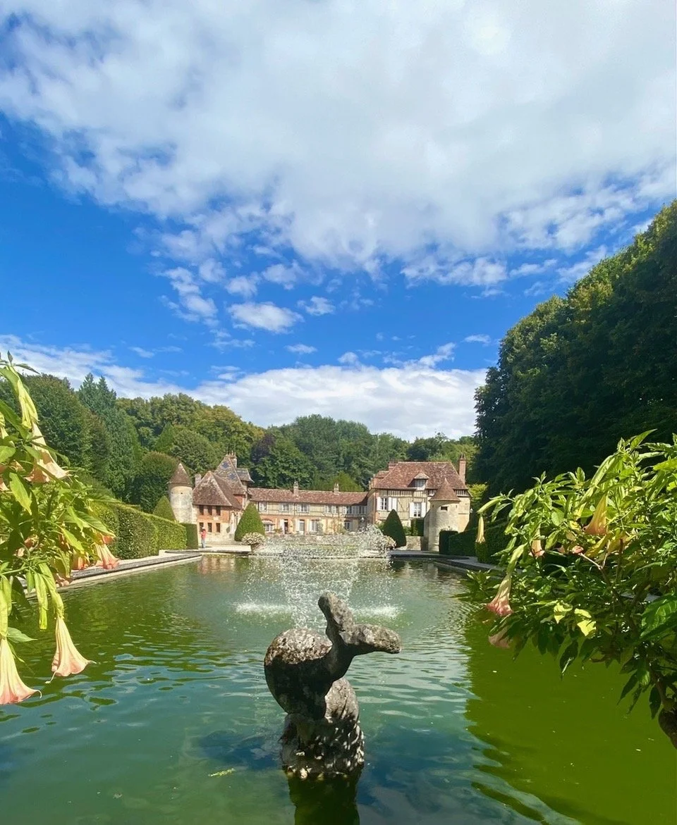 The gardens are a mix of French, English and Italian Renaissance styles and sensibilities. A French garden, bordered by lime trees, has topiary at the front and a suspended water mirror at the back. From the terrace, the view goes beyond the meadows of the Dives valley to the hills of the Pays d’Auge.